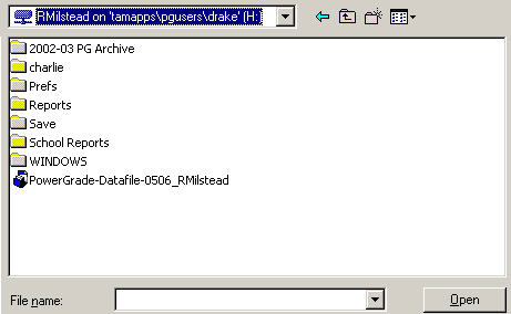 I can't find my datafile when I open PowerGrade - follow these steps for the solution. 1. Periodically Citrix/PowerGrade will not lead you to your grades datafile. Instead the Open window will look like this: