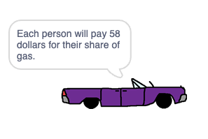 A statement that says “You have (number of passengers) passengers. Each person will pay (cost per person) dollars for gas money.