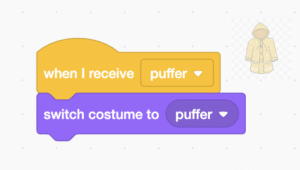 The code below is for the outfit sprite for when it receives a broadcast message. This will change the costume to the puffer jacket image: