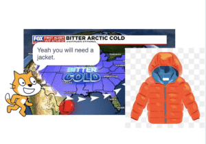 The code below is for the outfit sprite for when it receives a broadcast message. This will change the costume to the puffer jacket image:
